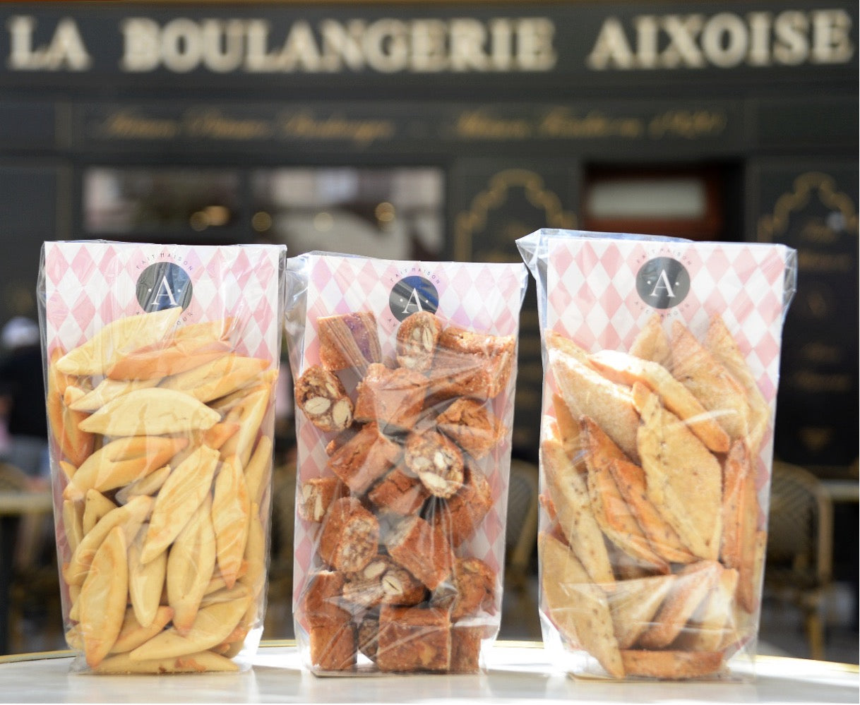 Savourez un assortiment de 1 kg de biscuits provençaux faits maison : Navettes parfumées, Canistrelli croustillants et Croquants aux amandes. Parfait à partager, offrir ou déguster.